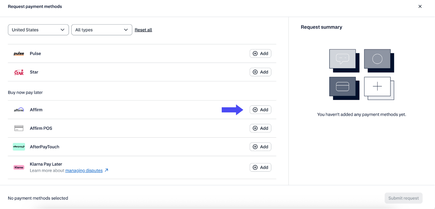 You may integrate Affirm through any of the Adyen-supported methods listed below: